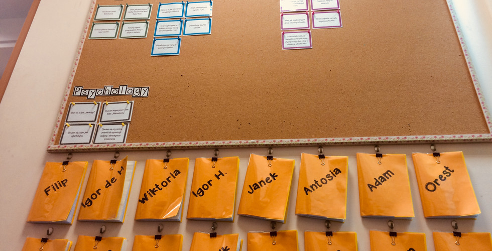 Na kartach na ścianie przyczepiamy plakaty wykonane na lekcjach. Akurat posprzątałam starocie, więc nic na nich nie ma 😝